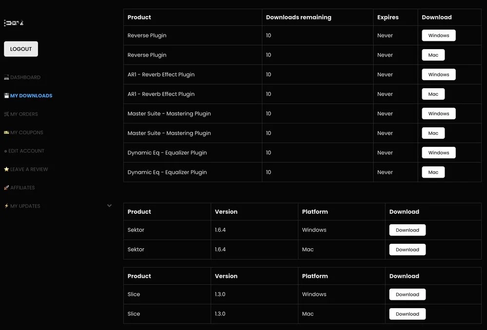 This crew has chosen a slightly convoluted way to get their stuff. If you have only a few of their products you have to click on the product page for each one (where you see the product image) then click the downloads button, then fill out a form to be sent a download link. If you own a few, they sell some of the products in various bundles and you are directed to use the download page for the bundle instead to save time. At this point you're shown the version numbers for the seperate Mac and Windows zip files which are all properly named. Minor points lost for not giving me a tickbox to opt-out of them opening both the product manual and a window of its cruft immediately after installation.