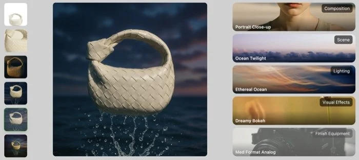 Use inspirational thumbnails as “layer elements” (they’re not actually layers) to guide the AI into composing the image you need. Aimed at product shots. Free 7 day trial, then US$24/month for 50 images without watermarks.